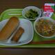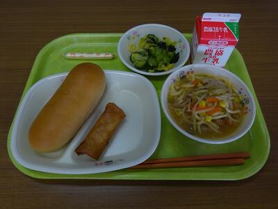 今日の給食は、ミニキャラメルコッペパン、みそラーメン、春巻き、チョレギサラダ、チーズ、牛乳でした。