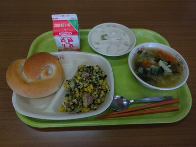 今日の給食は、米粉パン、スクランブルエッグ、ミートボールスープ、フルーツヨーグルトあえ、牛乳でした。