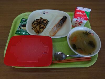 今日の給食は、ごはん、のりふりかけ、さけの塩焼き、ひじきの五目豆、じゃがいものみそ汁、牛乳でした。
