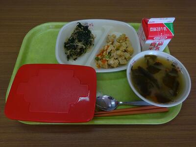 今日の給食は、ごはん、親子煮、ほうれん草のごまあえ、じゃがいものみそ汁、牛乳でした。