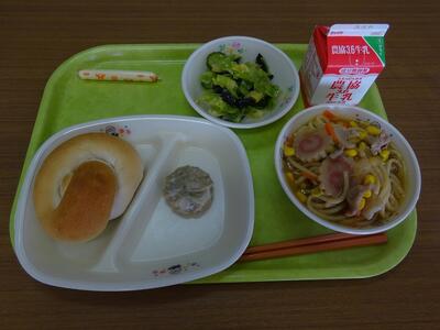 今日の給食は、ミニ米粉パン、しょうゆラーメン、にらまんじゅう、チョレギサラダ、チーズ、牛乳でした。