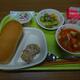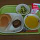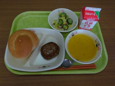 今日の給食は、バーガーパン、照焼きハンバーグ、フレンチサラダ、パンプキンポタージュ、牛乳でした。