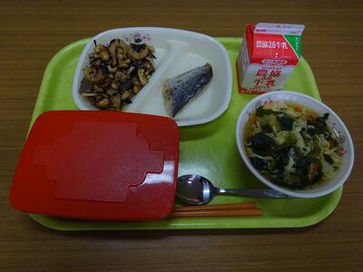 今日の給食は、ごはん、さわらの西京焼き、ひじきの五目豆、かきたま汁、牛乳でした。