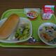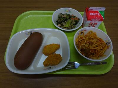 今日の給食は、ミニココアコッペパン、スパゲティナポリタン、チキンナゲット、ツナと海そうのサラダ、牛乳でした。