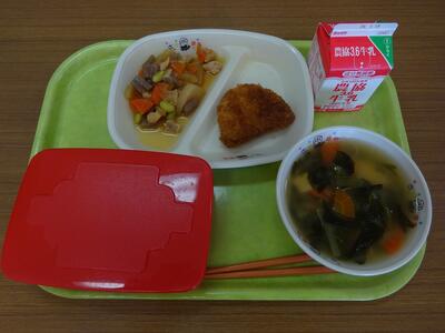 今日の給食は、ごはん、たれカツ、大根ととり肉の炒め煮、豆腐と小松菜のみそ汁、牛乳でした。