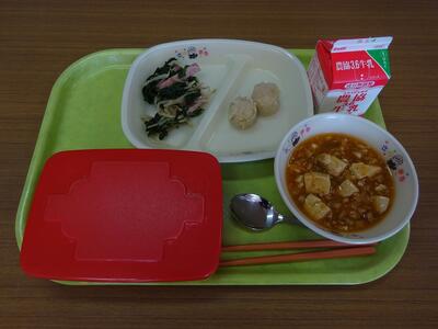 今日の給食は、もち麦ごはん、マーボー豆腐、えびしゅうまい、ほうれん草のナムル、牛乳でした。