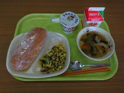 今日の給食は、揚げパン、スクランブルエッグ、チキンワンタンスープ、県産ヨーグルト、牛乳でした。