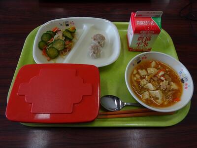 今日の給食は、もち麦ごはん、具だくさんマーボー豆腐、ポークしゅうまい、きゅうりともやしのサラダ、牛乳でした。