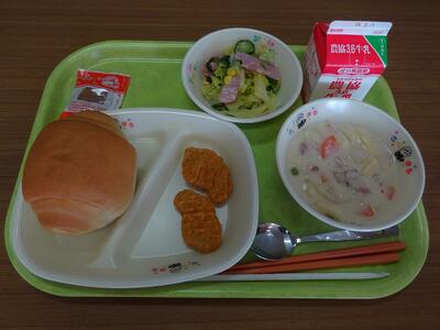 今日の給食は、バターロールパン、マカロニのクリーム煮、チキンナゲット、フレンチサラダ、牛乳、ミルメーク(コーヒー)でした。