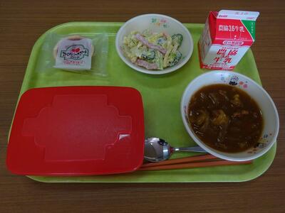 今日の給食は、ごはん、ポークカレー、マカロニサラダ、ストロベリーカスタードタルト、牛乳でした。