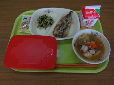 今日の給食は、ごはん、いわしのかば焼き、小松菜のごまあえ、けんちん汁、福豆、牛乳でした。
