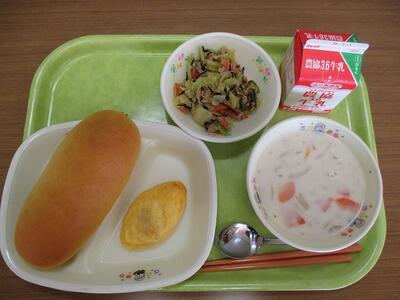 今日の給食は、パンプキンコッペパン、トマトオムレツ、ツナとひじきのサラダ、クラムチャウダー、牛乳でした。