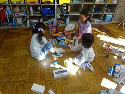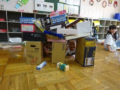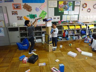 1年生算数「かたちあそび」の学習です。いろいろな形の空き箱を使って、いろいろな物を作りました。