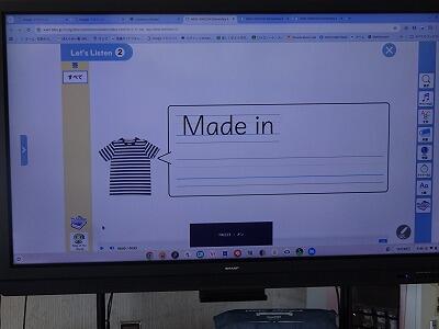 6年生外国語の授業の様子です。Made in 〇〇の言い方、国の名前は、1文字目は大文字になることを確認しながら進めていきました。