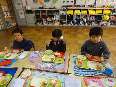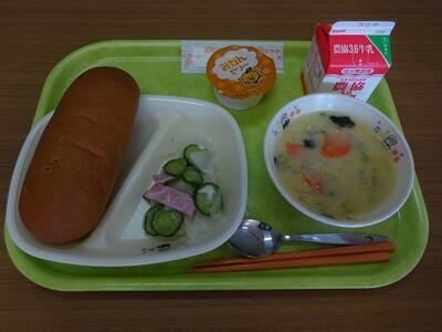 今日の給食は、黒コッペパン、白菜の豆乳シチュー、大根のマリネ、みかんゼリー、牛乳でした。