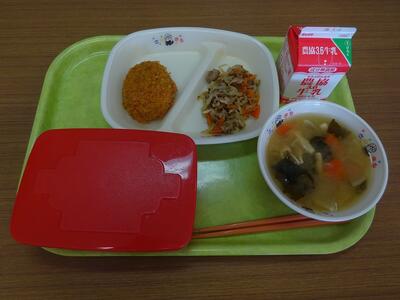 今日の給食は、ごはん、かぼちゃコロッケ、豚肉ともやしの炒めもの、大根のみそ汁、牛乳でした。