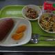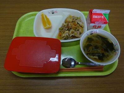 今日の給食は、ごはん、豚肉と厚揚げの香味炒め、中華スープ、オレンジ、牛乳でした。