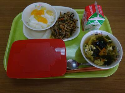 今日の給食は、ごはん、セルフビビンバの具、わかめと卵のスープ、フルーツ杏仁よせ、牛乳でした。