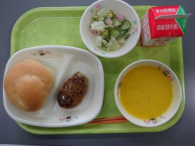 今日の給食は、バーガーパン、照焼きハンバーグ、フレンチサラダ、パンプキンポタージュ、牛乳でした。