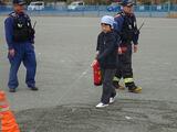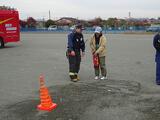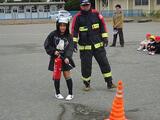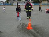代表児童の水消火器を使用した消火体験を行ったり、消防車による放水も見たりしました。