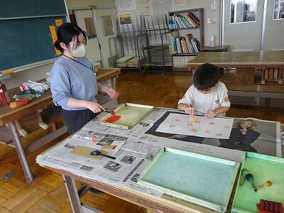 1年生図工「スタンプぺったん」と「うきうきボックス」の授業の様子で