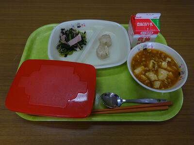 今日の給食は、もち麦ごはん、マーボー豆腐、えびしゅうまい、小松菜のナムル、牛乳でした。