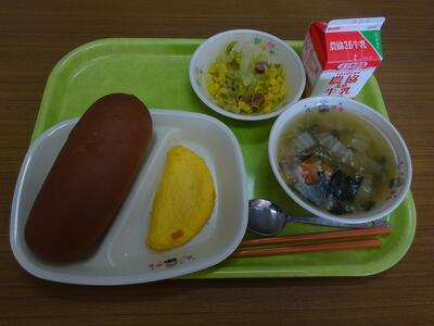 今日の給食は、ココアコッペパン、オムレツ、キャベツとコーンのソテー、ミートボールスープ、牛乳でした。