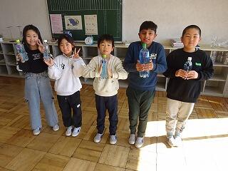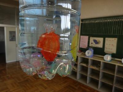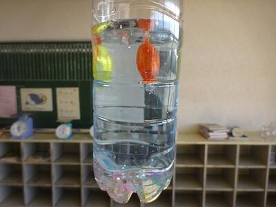 浮沈子(ふちんし)を行いました。ペットボトル内の水に浮かべた容器を容器を押す力で沈め、離すと浮かべるものです。 アルキメデスの原理とパスカルの原理の応用ですが、子どもたちは、単純に浮き沈みを楽しんでいました。 浮いている魚が🐟 ペットボトルを押すと沈みます。 ビー玉やビーズを沈めたり、水に色を付けたりしていました。