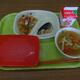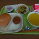 今日の給食は、バーガーパン、メンチカツ、小袋ソース、こんにゃくサラダ、パンプキンポタージュ、チョコプリン、牛乳でした。
