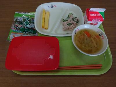 今日の給食は、酢飯、のり、小袋しょうゆ、玉子焼き、ツナマヨあえ、白菜のみそ汁、のり、牛乳でした。