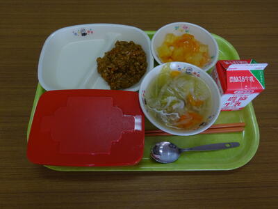 今日の給食は、ごはん、ドライカレー、野菜スープ、カラフルポンチ、牛乳でした。