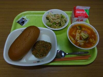 今日の給食は、黒コッペパン、さけのいそかフライ、小袋ソース、和風チキンサラダ、ミネストローネ、牛乳でした。