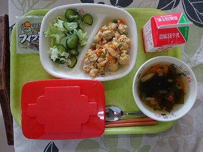 今日の給食は、ご飯、親子煮、野菜の浅漬け、わかめと麩のすまし汁、小魚、牛乳でした。